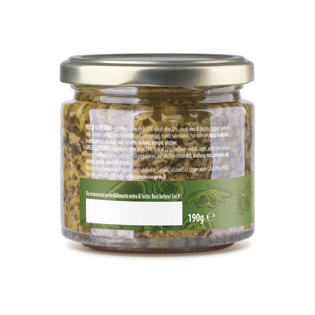 Ingredienti: olive verdi, olio di oliva, olio di semi di girasole, capperi, prezzemolo, menta, origano, aglio, peperoncino, aceto di vino bianco, sale.