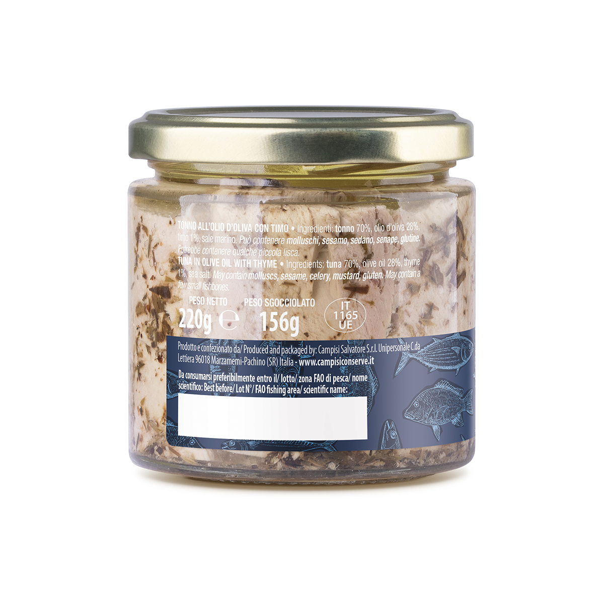 Ingredienti: tonno, olio di oliva, timo, sale marino.